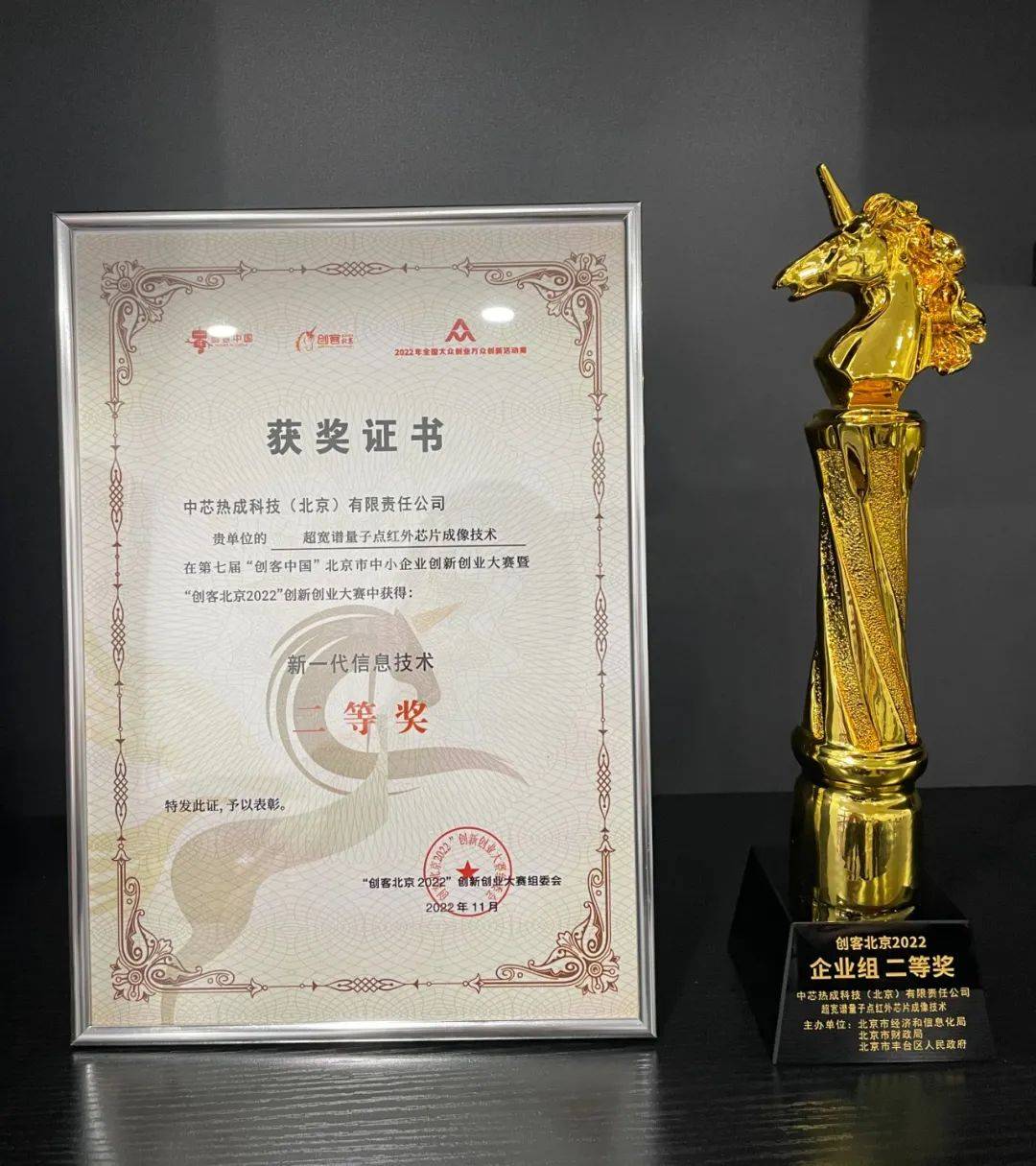 第七届“创客中国”北京市中小企业创新创业大赛暨“创客北京2022”创新创业大赛由工业和信息化部、财政部指导,北京市经济和信息化局、北京市财政局、丰台区人民政府主办。大赛分为区域赛和龙头企业专项赛,共4535个项目报名参赛,评选出229个获奖项目。中芯热成参赛项目——“超宽谱量子点红外芯片成像技术”,经过初赛、复赛、决赛以及排名赛的激烈角逐,最终获评企业组二等奖、新一代信息技术产业十强项目、北京区域赛TOP150优秀项目!