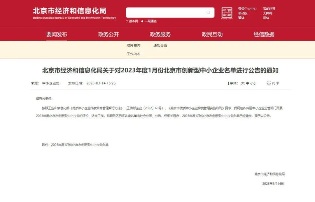 近日,北京市经济和信息化局官网公布2023年度1月份北京市创新型中小企业名单,中芯热成科技(北京)有限责任公司(以下简称“中芯热成”)成功入选,荣获“北京市创新型中小企业”称号。