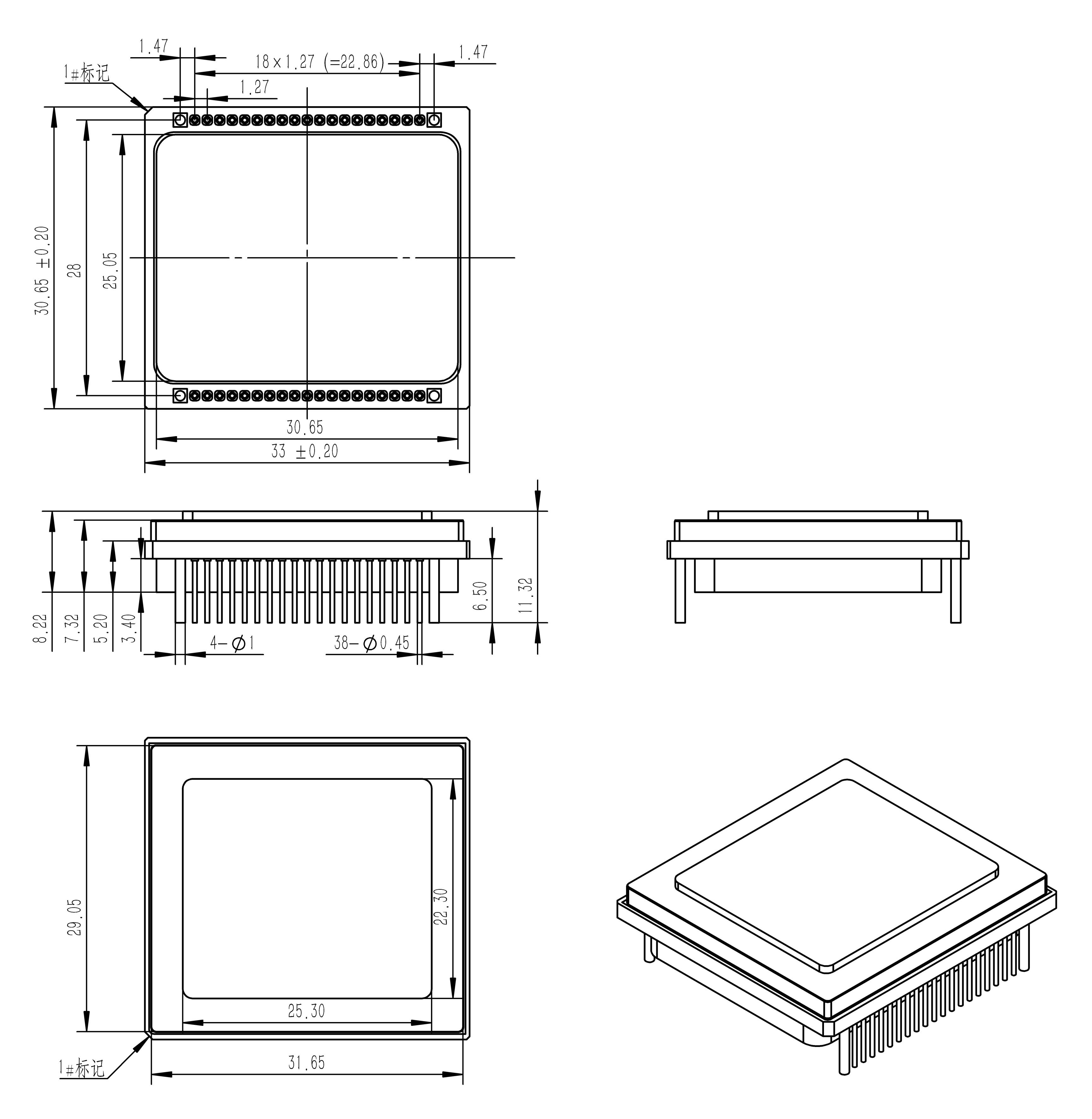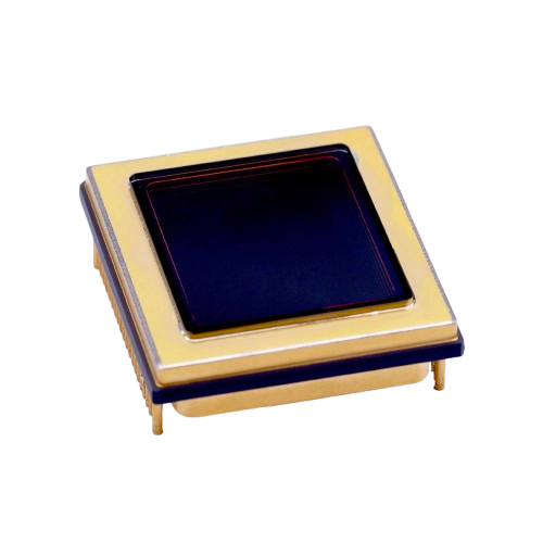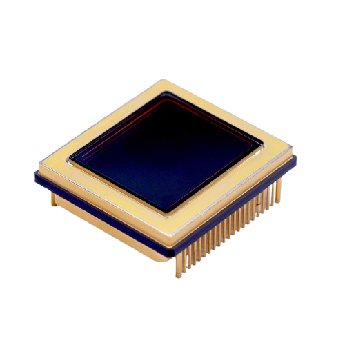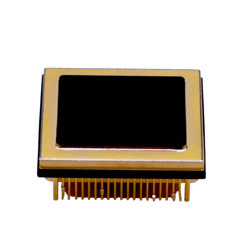 该款探测器采用陶瓷封装形式,充常压高纯氮气作为保护气,窗口使用的蓝宝石材质窗口片,探测器内外环境整体密封。探测器外形尺寸为33mm(L) ×30.7mm(W) ×11.32mm(H)。管壳上包含有42 根针脚从底部引出,采用双边单排形状,其中左右两端顶端引脚为4 根φ1mm 引脚,其余38 根引脚为φ0.45mm。引脚的主要功用为探测器的电源与时序信号输入、探测器的光电信号输出、指示信号输出、TEC 电压输入和温度传感器的电学引出。